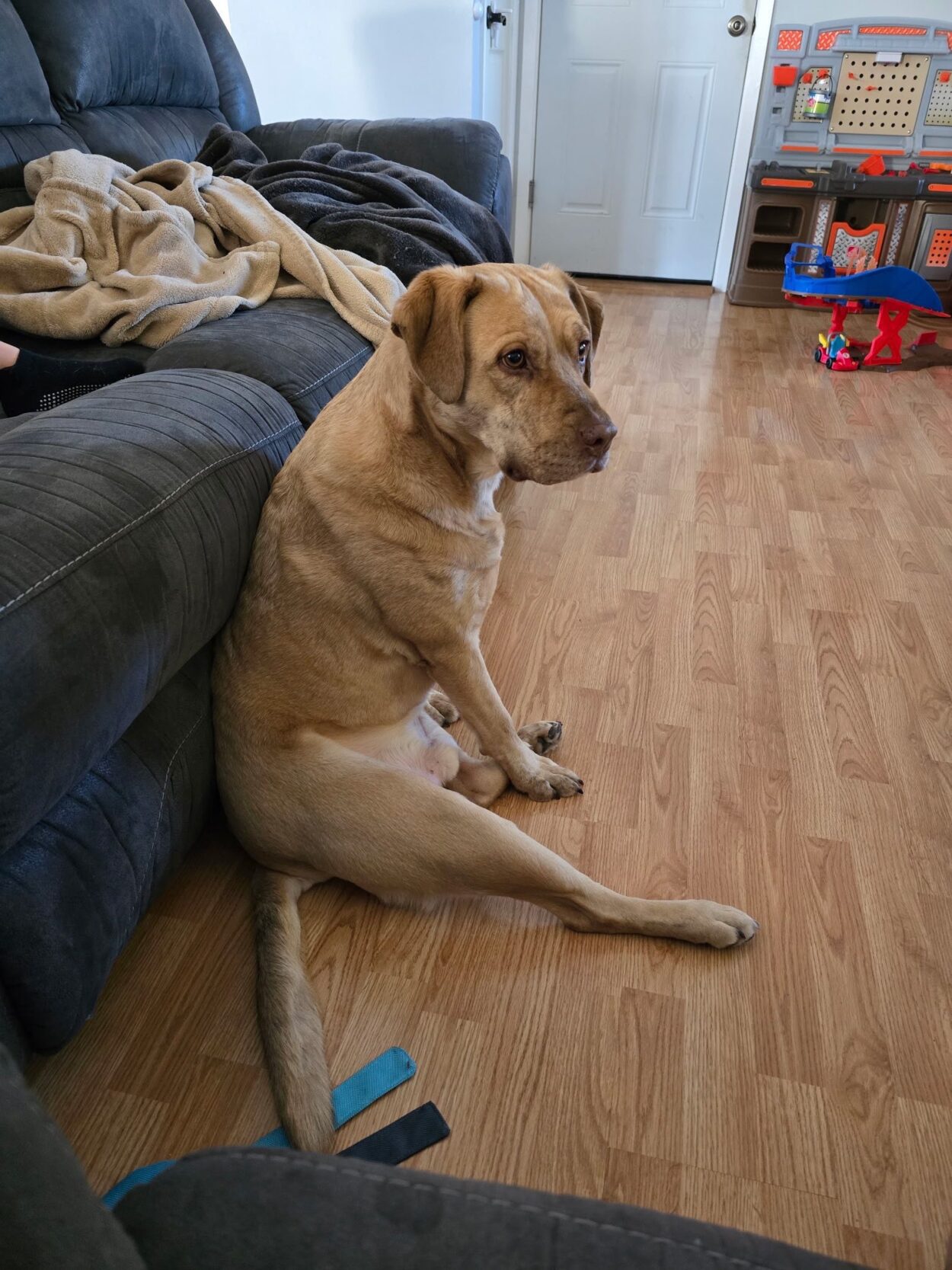 It breaks my heart to have to write this, but hoping someone can provide a better home to Rusty than we can. Rusty is an approximately 4 year old Yellow Lab mix, and he’s been in our home for the past 2 years He’s in great health, with no health issues/concerns. He’s an extremely sweet dog, who loves any and all attention from humans. He’s extremely good with kids. Our 2 boys (2 & 4) can lay on him and he’ll just lay there and let them do whatever. He’s house trained. The most we’ve left him alone was 8 hours, and he was completely fine (he has free roam of our home). Knows all basic commands and a little more. He has been trained with a training collar and responds well to his collar. He is very food driven. Overall he’s a pretty chill dog. He loves to lay outside in the sun. And look out the windows inside the house. He likes to play fetch with anything. Or just lay outside chewing on a bone.